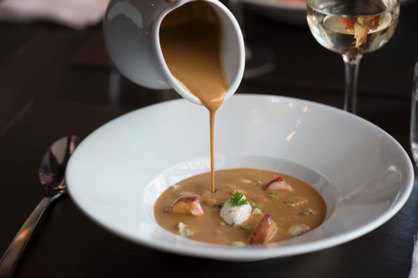 Velouté de crustacés, homard et ravioles au fromage